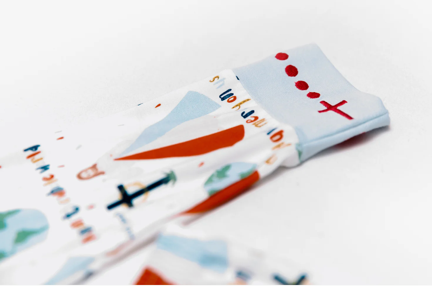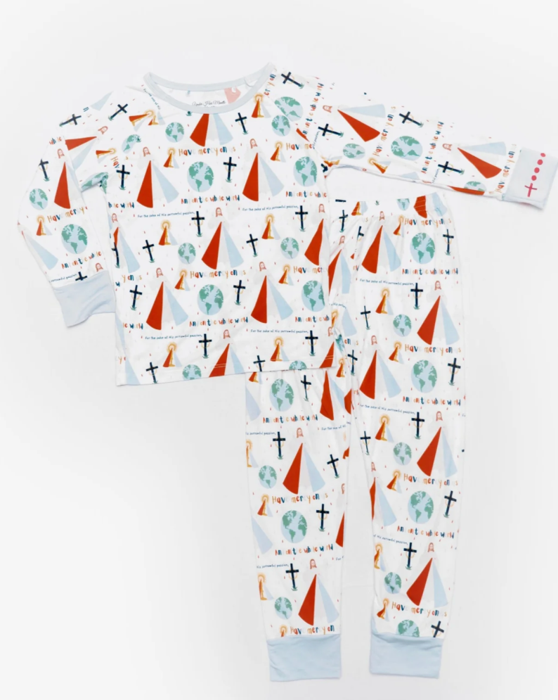 These fun and whimsically patterned pajamas serve as a reminder of the importance of prayer before bed. The embroidered rosary bead detailing on the wrist helps teach children from an early age how to pray.