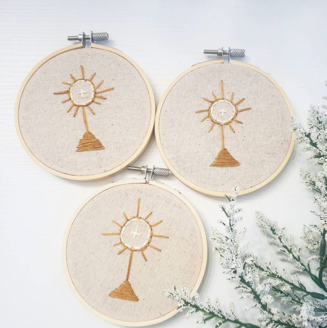 4 inch hoops with hand embroidered gold Monstrance. Perfect for a Christmas tree, small space or gift.