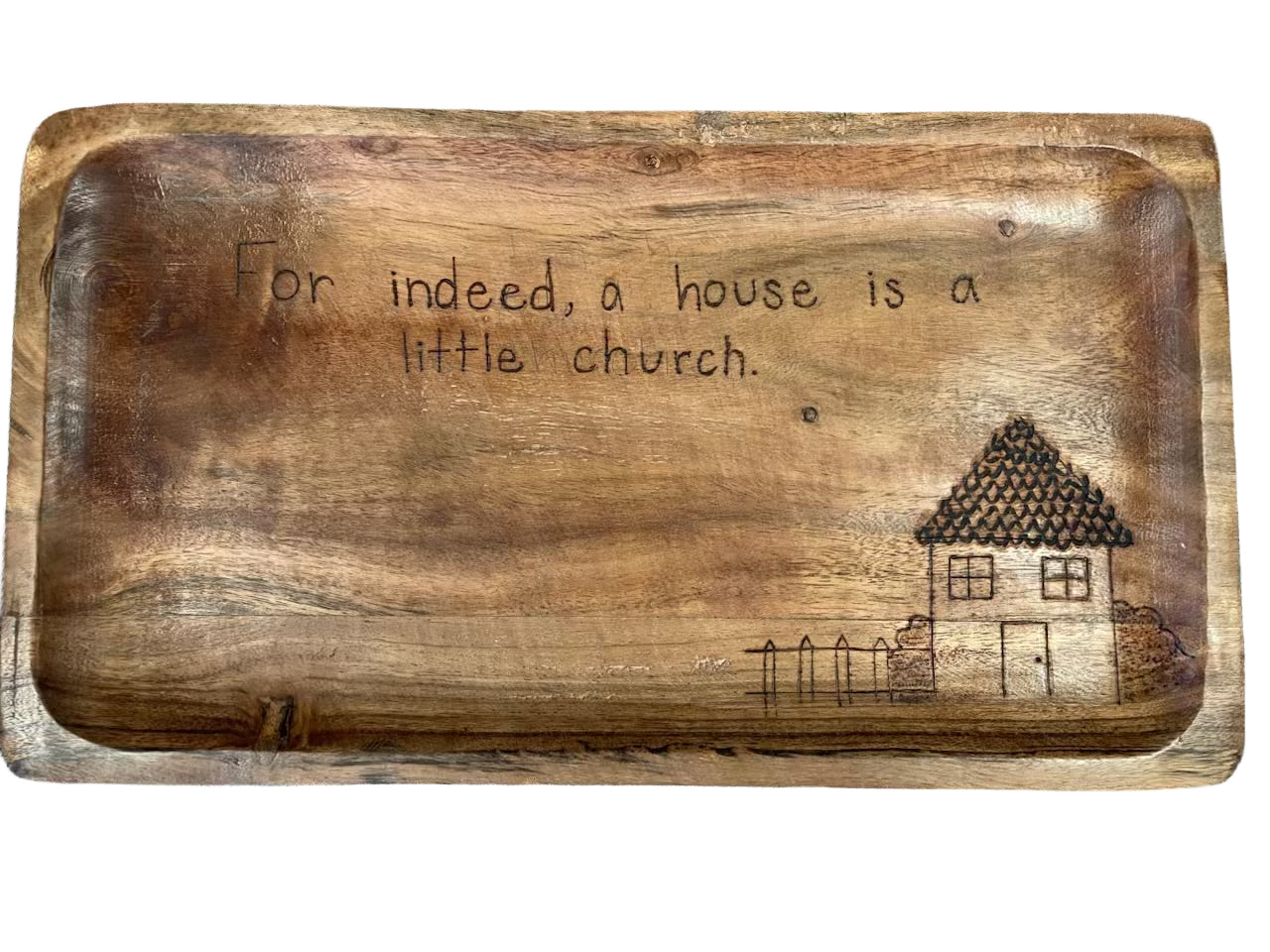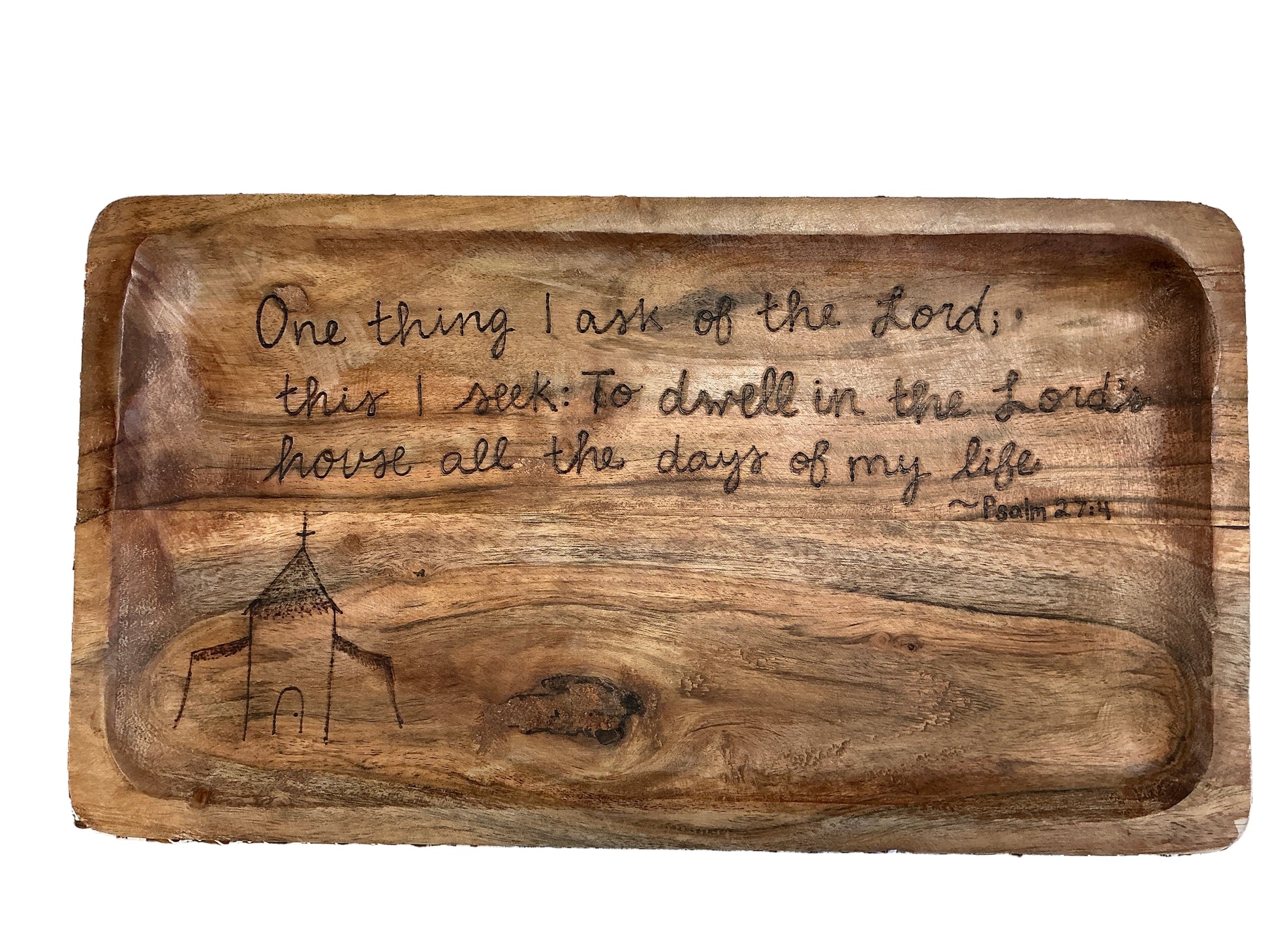 8" x 14" Rectangular wooden tray with hand-etched images and verses.