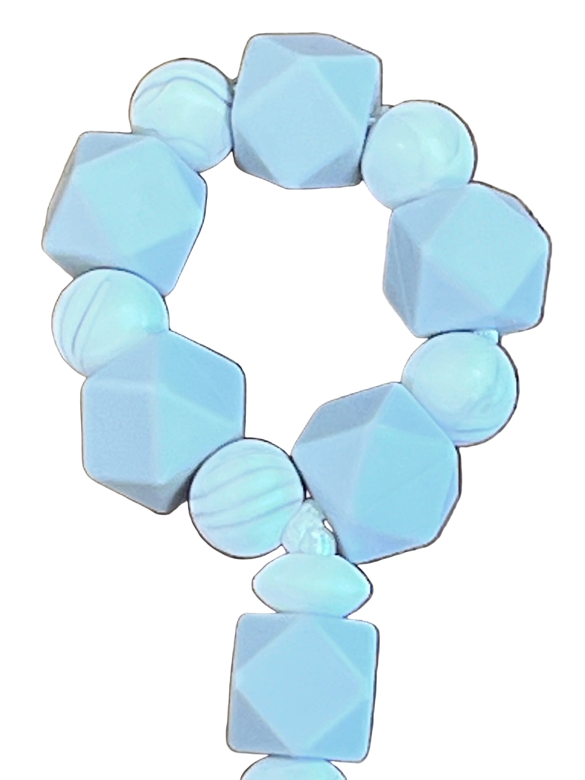 Safe, non-toxic chewable baby teether. Round beads measure 12mm and hexagon beads are 14mm. The breakaway clasps are plastic and triple knotted. Knots are heat sealed.