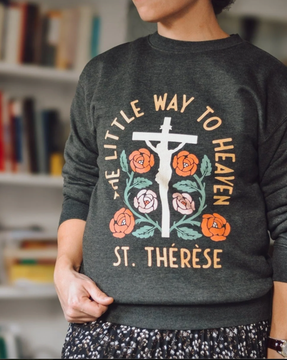 Our St. Thérèse design was a special commemoration of the 150th anniversary of her birth is now a soft crewneck sweatshirt! Layer it up or wear it on its own.